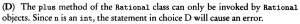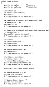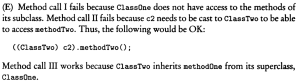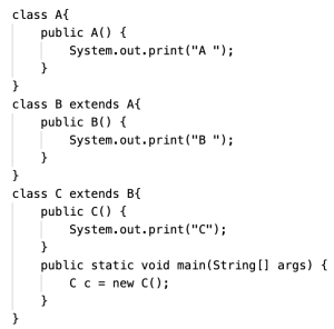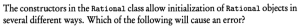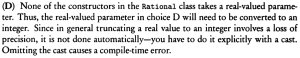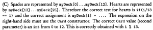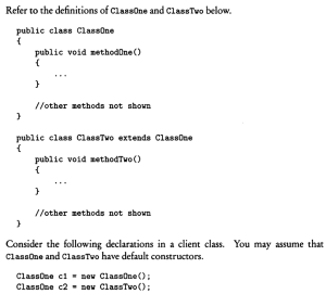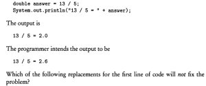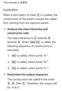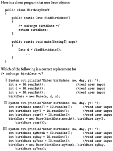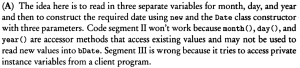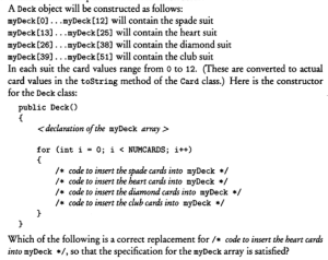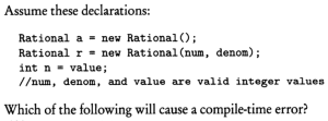 0% 0 votes, 0 avg 23 1234567891011121314151617181920 This quiz randomly generates 20 questions as asked in AP Computer Science A (AP CSA) - Programming in Java. Congratulations! AP Computer Science A (AP CSA) - Programming in Java This quiz randomly generates 20 questions (in 30 mins) as asked in AP Computer Science A (AP CSA) - Programming in Java. 1 / 20 What is the output? A B B A A Null Pointer Exception is thrown at runtime. A 0 B 1 2 / 20 Question The method reduce() is not a public method because methods whose return type is void cannot be public. methods that change this cannot be public the reduce() method is not intended for use by clients of the Rational class. the reduce() method is intended for use only by clients of the Rational class. the reduce() method uses only the private data fields of the Rational class. 3 / 20 A programmer is designing a program to catalog all books in a library. He plans to have a Book class that stores features of each book: author, title, isOnShelf and so on, with operations like getAuthor, getTitle, getShelfInfo, and setShelfInfo. Another class, LibraryList, will store an array of Book objects. The LibraryList class will include operations such as listAllBooks, addBook, removeBook, and searchForBook. The programmer plans to implement and test the Book class first, before implementing the LibraryList class. The programmer's plan to write the Book class first is an example of top-down development. bottom-up development. procedural abstraction. information hiding. a driver program. The programmer is using an object-oriented approach to writing the program and plans to test the simplest classes first. This is bottom-up development. In top down development (choice A), high-level classes are broken down into subsidiary classes. Procedural abstraction (choice C) is the use of helper methods in a class. Information hiding (choice D) is restriction of access to private data and methods in a class. Choice E is wrong because a driver program is one whose sole purpose is to test a given method or class. Implementing the simplest classes hrst may involve driver programs that test the various methods, but the overall plan is not an example of a driver program. 4 / 20 Refer to the following code fragment: double answer = (double) 13 / 5; double answer = 13 / (double) 5; double answer = 13.0 / 5; double answer = 13 / 5.0; double answer = (double) (13 / 5); 5 / 20 Question None I only II only III only I and II only 6 / 20 What is the output? 1:2:3:4:5: 1:2:3: Compilation fails An ArrayOutOfBoundsException is thrown at runtime Four words become HiHowAreYou, since its length is more than 4, nothing will be removed and HiHowAreYou removed will be printed. 7 / 20 What is the output? Compilation fails. The program compiles, but it prints nothing. HiHowAreYou removed An UnsupportedOperationException is thrown at runtime. 8 / 20 Question 74 47 734 743 347 9 / 20 Question r = a.plus(r); a = r. plus (new Rational (n)); r = r.plus(r); a = n. plus(r); r = r. plus (new Rational(n)); 10 / 20 What is the output? C B A C A B C Compilation fails at line n1 and line n2 11 / 20 Question Which of the following is a false statement about the methods? equals, lessThan, and toString are all accessor methods. increment is a mutator method. Time() is the default constructor. The Time class has two constructors. There are no static methods in this class. 12 / 20 Question Rational r1 = new Rational(); Rational r2 = r1; Rational r3 = new Rational (2,-3); Rational r4 = new Rational (3.5); Rational r5 = new Rational (10); 13 / 20 What is the output? An exception is thrown at runtime. 07-31-2014 2014-07-31 2014-09-30 14 / 20 The boolean expression !A && B || C is equivalent to !A && (B II C) ((!A) && B) II C (!A) && (B II C) !(A && B) II C !(A && B II C) 15 / 20 What is the output? Compilation fails at line n2. Compilation fails at line n1 20:20 10:20 16 / 20 Question I only II only III only I and II only I and III only 17 / 20 For the sample code: Consider this description of the Deck constructor: if (i / 13 == 1) myDeck [i / 13] = new Card("hearts", i % 13); i f (i >= 13 && i <= 25) myDeck [i % 13] = new Card("hearts", i % 13); i f ( i / 13 == 1) myDeck [i] = new Card("hearts", i % 13); i f (i >= 13 && i <= 25) myDeck [i] = new Card("hearts", i / 13); i f (i / 13 == 1) myDeck [i % 13] = new Card("hearts", i % 13); 18 / 20 Question Round-off eror was caused by calculations with floating-point numbers. Type boolean was not recognized by an obsolete version of Java. An overflow error was caused by entering numbers that were too large. c and d should have been cast to integers before testing for equality. Bad test data were selected. 19 / 20 What is the output? 1 2 3 0 01 2 3 0 0 An Exception is thrown at run time. 1 2 3 0 01 2 3 1 2 31 2 3 20 / 20 Which code fragment, when inserted at line 6, enables the code to print true? String str2 = str1; String str2 = new String(str1); String str2 = sb1.toString(); String str2 = "Duke"; Your score is 0% Restart quiz