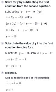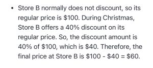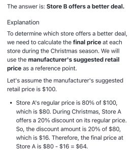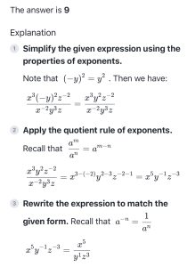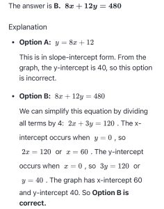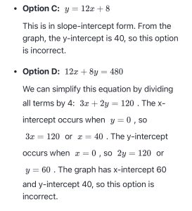 0% 0 votes, 0 avg 68 12345678910111213141516171819202122 The Digital SAT has two Math Modules, each with 35 minutes to solve 22 questions. This quiz is randomly generated to simulate a mix of modules. End of the quiz, we provide answers with the detailed explanation. Score 19+ correct to rank in the top 3% percentile. Keep practicing to improve your score. Use Desmos online calculator if you need, its allowed in the real test : https://www.desmos.com/calculator Congratulations! In SAT math, scoring all 22 questions correct yields an 800. Missing 1–2 questions results in a 780–790. Missing 3–5 questions gives a 750–780, and 6–10 wrong yields a 700–750. Refresh this page for a new random set of test questions from our extensive pool. Bookmark and retake this test to consistently reach your target score. Detailed answers are provided at the end of each quiz. Digital SAT Math Quiz This quiz randomly generates 22 questions as asked in Digital SAT Math. 1 / 22 Solve 3 5 7 9 2 / 22 If a / b = 2, what is the value of 4b/a ? 0 1 2 4 3 / 22 What is the value of m +n + p ? 3 9 12 15 4 / 22 A square field measures 10 meters by 10 meters. Ten students each mark off a randomly selected region of the field; each region is square and has side lengths of 1meter, and no two regions overlap. The students count the earth worms contained in the soil to a depth of 5 centimeters beneath the ground’s surface in each region. The results are shown in the table below. Which of the following is a reasonable approximation of the number of earth worms to a depth of 5 centimeters beneath the ground’s surface in the entire field? 150 1500 15000 150000 5 / 22 Which of the following is an equivalent form of the equation of the graph shown in the xy-plane below, from which the coordinates of vertex A can be identified as constants in the equation? y = ( x+3)( x−5) y = ( x-3)( x+5) y = x( x-2) − 15 y = ( x-1)2 − 16 6 / 22 Which of the following is equivalent to the expression below? 8xy2 - 6y2 2x2y - 2xy2 2x2y + 2xy2 4x2y2 7 / 22 The number of roof tops with solar panel installations in 5 cities is shown in the graph below. If the total number of installations is 27,500, what is an appropriate label for the vertical axis of the graph? Number of installations (in tens) Number of installations (in hundreds) Number of installations (in thousands) Number of installations (in tens of thousands) 8 / 22 Based on the histogram below, of the following, which is closest to the average (arithmetic mean) number of seeds per apple? 4 5 6 7 9 / 22 According to the system of equations below, what is the value of x ? x + y = −9 x + 2y = −25 -16 7 25 -5 10 / 22 The graph shows the relationship between the number of shares of stock from Company A, x, and the number of shares of stock from Company B, y, that Simone can purchase. Which equation could represent this relationship? y = 8x + 12 8x + 12y = 480 y = 12x + 8 12x + 8y = 480 11 / 22 A product is currently priced at $10. If it is discounted by 10%, the profit margin will be 10%. What is the cost of the product? $8.15 $8.25 $8.1 $8 12 / 22 Solve -xy/2 -2/x -2y/x2 -2y/x 13 / 22 In the figure below, line a is parallel to line b. Line c intersects both a and b with angles 1, 2, 3, 4, 5, 6, 7, and 8 as shown. Which of the following lists include all of the angles that are congruent to angle 6? angles 5, 7, 3, and 1 angles 8, 4, and 3 angles 8, 4, and 2 angles 5, 7, and 3 14 / 22 An object’s speed is 32 yards per second. What is the object’s speed, in feet per second? (1 yard = 3 feet) 90 ft/sec 92 ft/sec 96 ft/sec 98 ft/sec 15 / 22 If 4x + 2 = 12, what is the value of 2x + 1? 16 8 2 6 2x + 1 is just half of 4x + 2 so (1/2)12 = 6 16 / 22 Given x = 120 and r = 9, find the area of the sector: 3π 9π 18π 27π 17 / 22 The price of a stock is down 5% today. What percent increase would return the stock to its original price? 5.26% 5% 5.5% 5.75% 18 / 22 If a = 5√2 and 2a = √2x , what is the value of x ? 4 2 10 100 19 / 22 In a right triangle, one angle measures x°, where sin x° = 4/5. What is cos(90 - x°) ? 1/5 4/5 3/5 2/6 20 / 22 Two toy stores, A and B, sell Game Boys. The regular price at store A is 80% of the manufacturer’s suggested retail price. Store B normally does not discount at all. During Christmas season, store A discounts the product by 20% off its regular price. Store B discounts it by 40% off its regular price. Which store offers a better deal? Store A offers a better deal Store B offers a better deal Both stores offer same deal Not enough information 21 / 22 Solve: -(4/3) -4 4/3 4 22 / 22 Four pizzas are ordered for the children at a party. Each pizza is cut into 8 equal slices. Each child eats 2 slices. There are 2 slices left. How many children are at the party? Check Your score is 0% Restart quiz